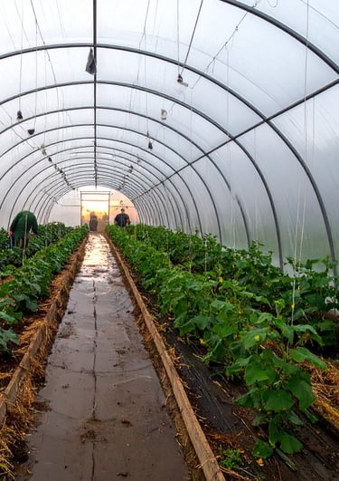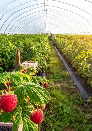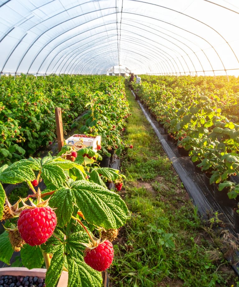 This dual-crop greenhouse is designed for berry excellence, with ideal conditions for raspberries and blueberries. Plants are grown in pots and raised beds, supported by precise irrigation and regular hand-picking to guarantee rich color, sweetness, and shelf life.