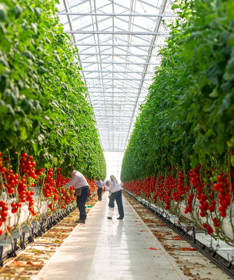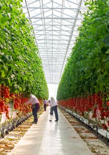 Our tomato greenhouse features vertical vine systems with professional climate control to produce vibrant, juicy tomatoes. Staff manage pruning, inspection, and harvesting daily to maintain quality, consistency, and strong crop health.