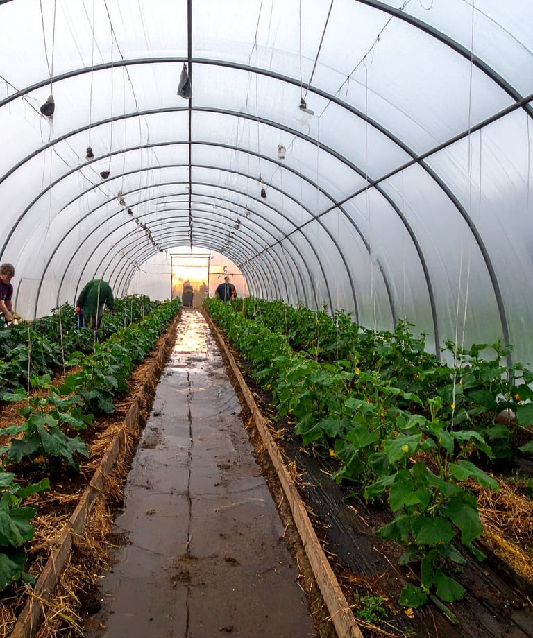 This mixed greenhouse supports both cucumbers and aubergines with tailored warmth, humidity, and support structures. Workers regularly monitor growth and watering to ensure each plant develops fresh, high-grade produce ready for commercial distribution.